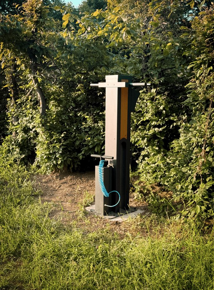 Cykloturisti ocenia praktický servisný stojan, kde si môžu rýchlo upraviť alebo opraviť svoj bicykel. Je vybavený základným náradím a podporuje koncept bike-friendly miest.