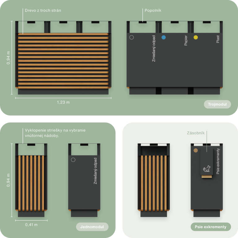 Naše odpadkové koše sa vyznačujú pevnou a odolnou konštrukciou, ktorá je navrhnutá tak, aby odolala náročným poveternostným podmienkam. Koše sú vyrobené z kvalitnej ocele, ktorá je chránená práškovým nástrekom, čo zabezpečuje dlhú životnosť a ochranu proti korózii. K tomu sa pridáva estetický prvok – drevené laty morené špeciálnym lakom, ktoré dotvárajú príjemný prírodný vzhľad. Koše tak nielen plnia svoju praktickú funkciu, ale aj vizuálne obohacujú verejný priestor, čím sa stávajú atraktívnym prvkom mestského mobiliáru.